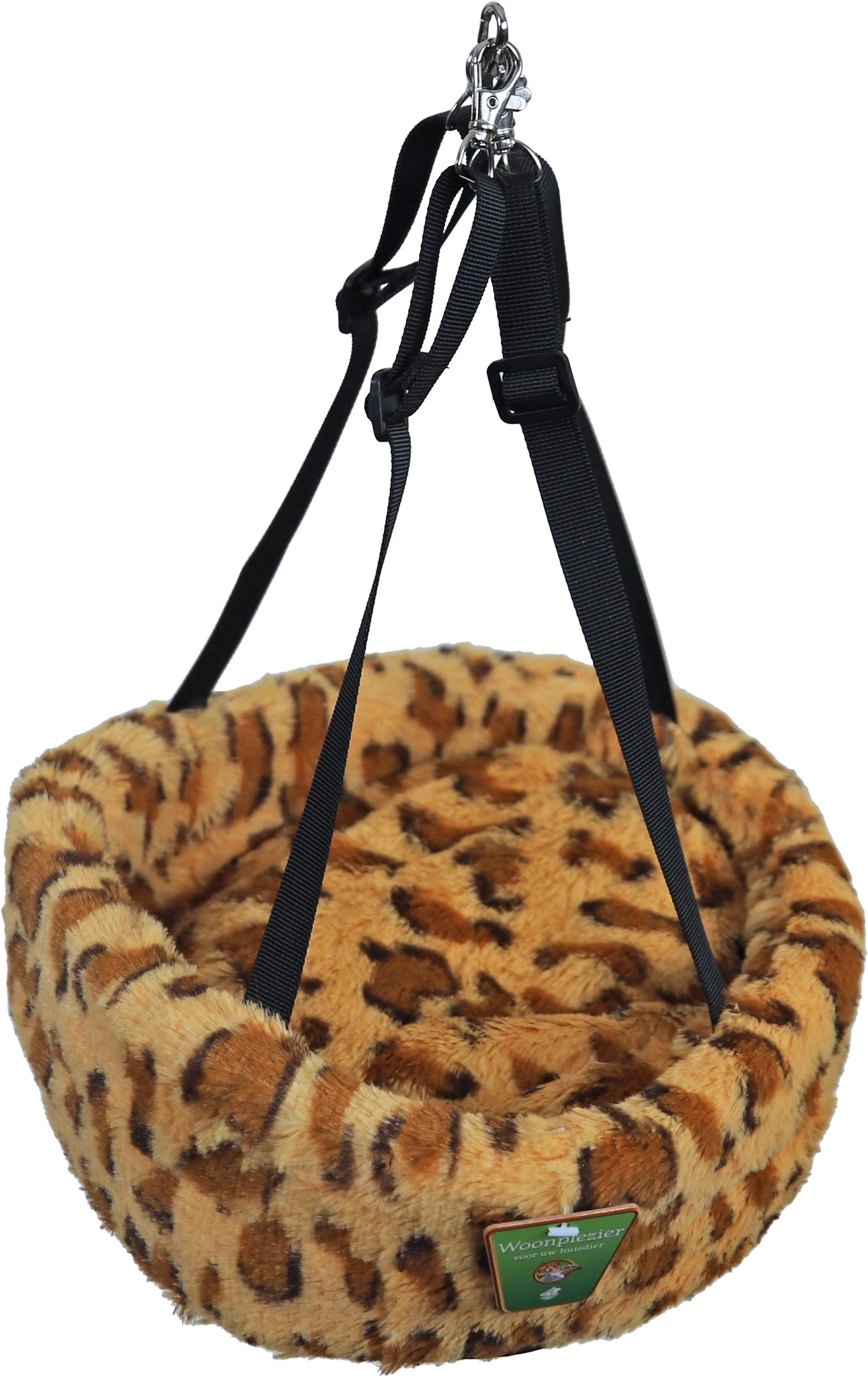 Deze hangmand is een ideale comfortabele slaapplaats voor uw knaagdier. De 4 verstelbare nylon ophangpunten zijn voorzien van metalen karabijnhaken, waardoor de mand in ieder verblijf makkelijk op te hangen is. Wordt geleverd met een kussen welke 2-zijdig kan worden gebruikt. Het kussen is namelijk voorzien van een pluche luipaard print aan de ene kant en een pluche zwarte zijde aan de andere kant. Afmeting: afmeting: 25x25x10 cm