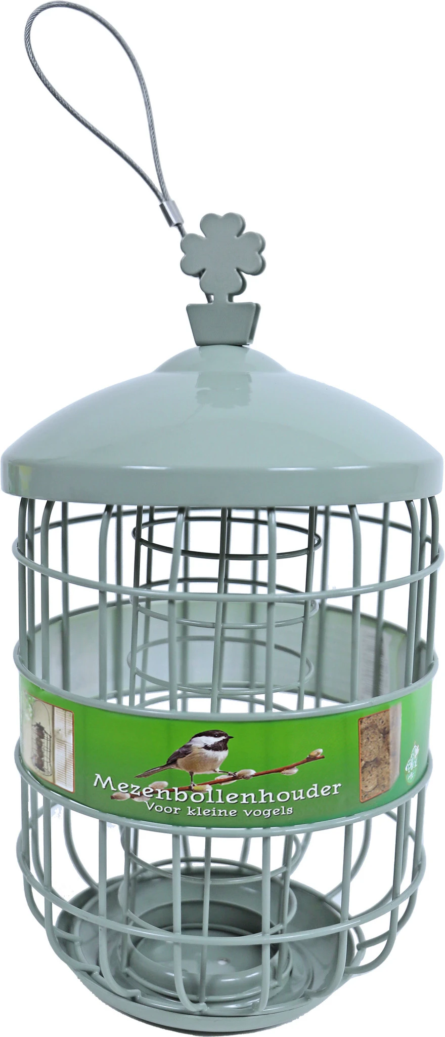 De metalen mezenbolhouder grijs/groen voor kleine vogels is speciaal ontworpen om mezenbollen te voeren aan de kleine vogels. Door het metalen rooster aan de buitenzijde met fijne mazen is het onmogelijk voor grote vogels om de mezenbollen te bereiken. De mezenbolhouder is gemakkelijk te vullen en schoon te maken, doordat de bovenzijde makkelijk los te maken is. De mezenbolhouder is ook gemakkelijk op te hangen door het geïntegreerde ophangsysteem van metaaldraad. Dankzij deze mezenbolhouder geniet u van etende kleine vogels in uw tuin of balkon die niet worden weggejaagd door grote vogels. De afmeting is 29.5X18 cm.