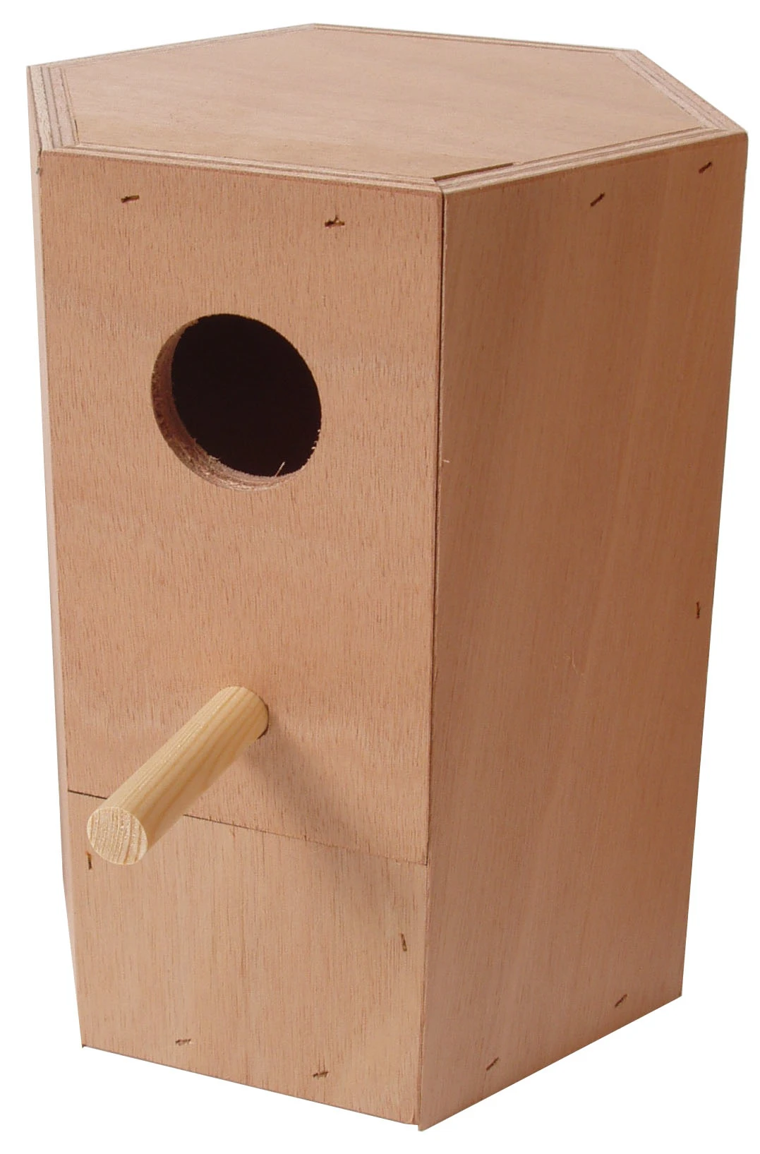 Houten broedblok in de vorm van een zeskant. Heeft een zitstokje aan de voorkant. Verkrijgbaar in 4 maten.