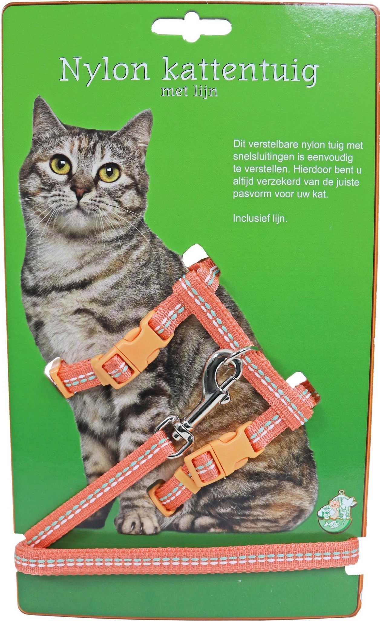 Nylon kattentuig met lijn met een leuk decoratief stiksel. Dit verstelbaar nylon tuig met snelsluitingen is eenvoudig te verstellen. Hierdoor bent u altijd verzekerd van de juiste pasvorm voor uw kat. Inclusief lijn. Verkrijgbaar in meerdere kleuren combinaties.