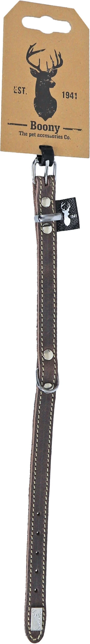 Echt lederen halsband van het merk Boony ‘EST 1941’. Hoogwaardige kwaliteit, geproduceerd in Nederland met alleen kwaliteits onderdelen, voorzien van metalen Boony ‘EST 1941’ logo. Verkrijgbaar in 3 kleuren en per kleur in 9 verschillende maten.