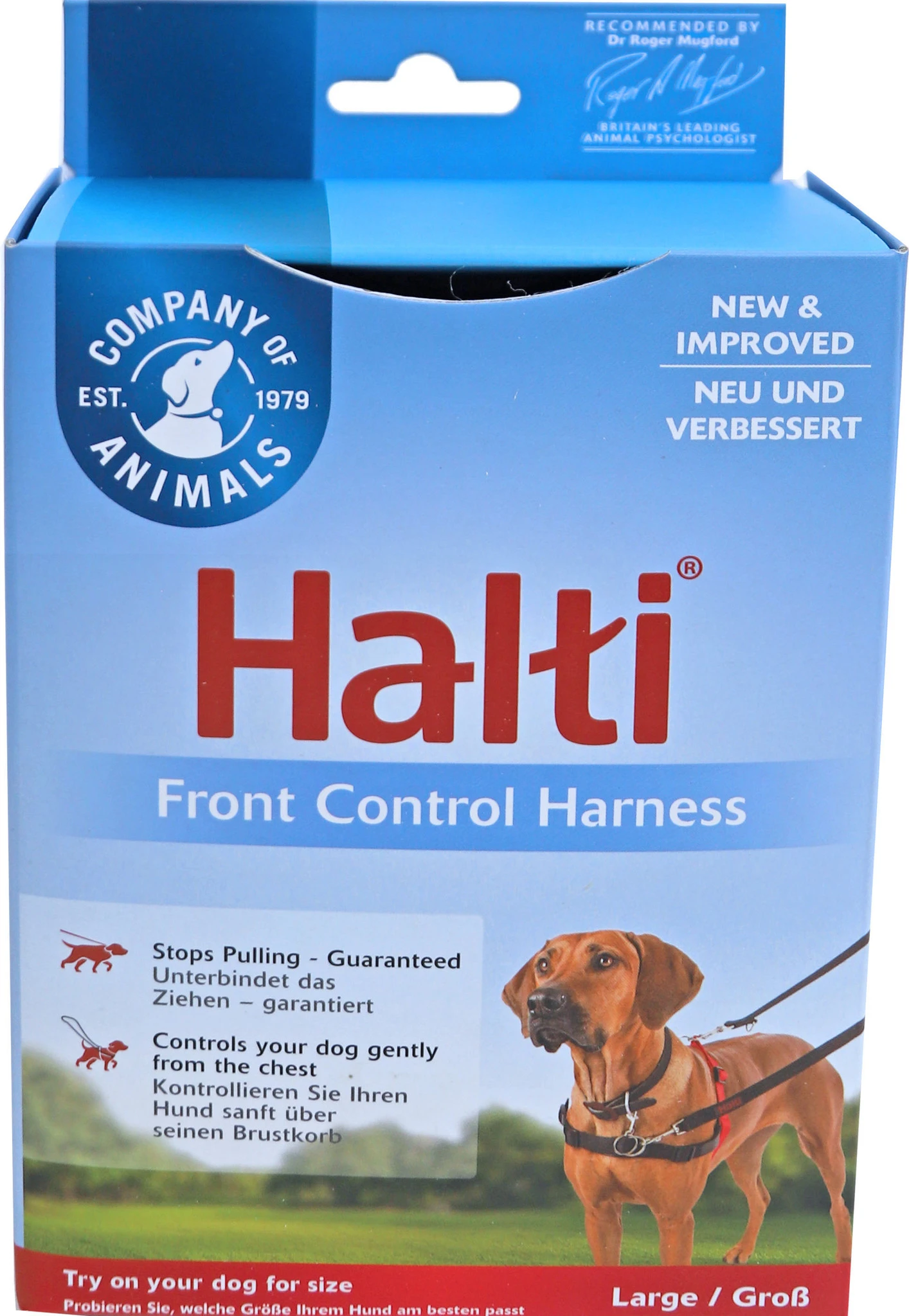 Halti front control harness is een harnas ontworpen om de hond tegen te trekken en biedt stuurcontrole over de borst en niet op het hoofd. Het hondentuig is voorzien van een ring op de rug en een musketonhaak bij de borst. Het harnas wordt geleverd zonder riem. Voor een maximale controle kunt u de Halti Trainingslijn gebruiken. U kunt ook uw eigen hondenriem gebruiken.