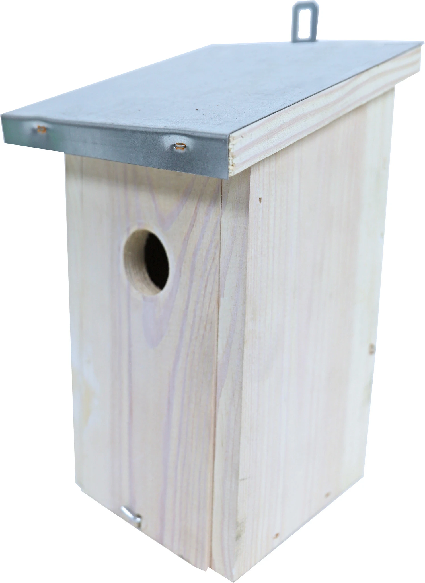 Mezenkast hout voor buiten met schuin zinkdak wit is ideaal voor in uw tuin. Mezen kunnen in alle rust hun nestje maken en u kan genieten van de vogeltjes in uw tuin. De mezenkast is voorzien van een ronde opening en een hanghaakje. Hang de nestkast op minimaal 1,8 meter hoogte, zodat katten er niet bij kunnen. Zorg er voor dat de mezenkast op een rustige plaats hangt waar de vogels niet of weinig gestoord worden. Mezen hebben graag een vrije aanvliegroute zonder takken en bladeren voor de invliegopening. Verkrijgbaar in 2 kleuren.