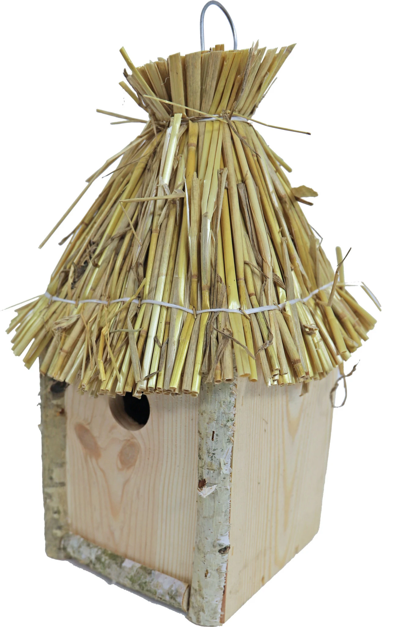 Mezenkast vierkant met stro dak hangbaar, puur natuurlijke look. Dit leuke vogelhuisje is gemaakt van blank hout met berken opzetstukjes en heeft een stro dak. Het huisje kan door middel van een metalen haak opgehangen worden. Leuk als decoratie in elke tuin.