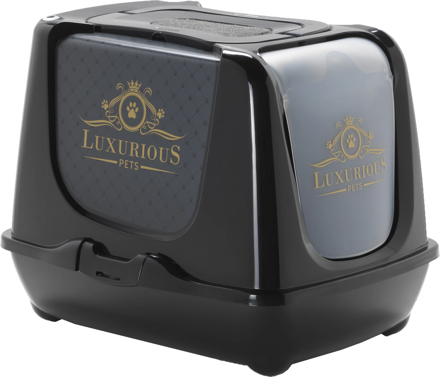 Moderna kattentoilet Trendy Cat Luxurious zwart is een modieus kattentoilet met afmetingen 50×39,5×37,5 cm. De Trendy Cat is gemaakt van premium kwaliteit plastic voor langdurig gebruik. Beschikt over een makkelijk handvat en is met een kras en UV-bestendig goudkleurige decoratie Luxurious. Doorschijnende deur met decoratie voor extra privacy en is inclusief een kattenbakschep en koolfilter. Het bovenste gedeelte heeft 2 stevige goedsluitende klemmen om de boven en onderkant aan elkaar te bevestigen. Gemakkelijk te reinigen met een warm sopje.