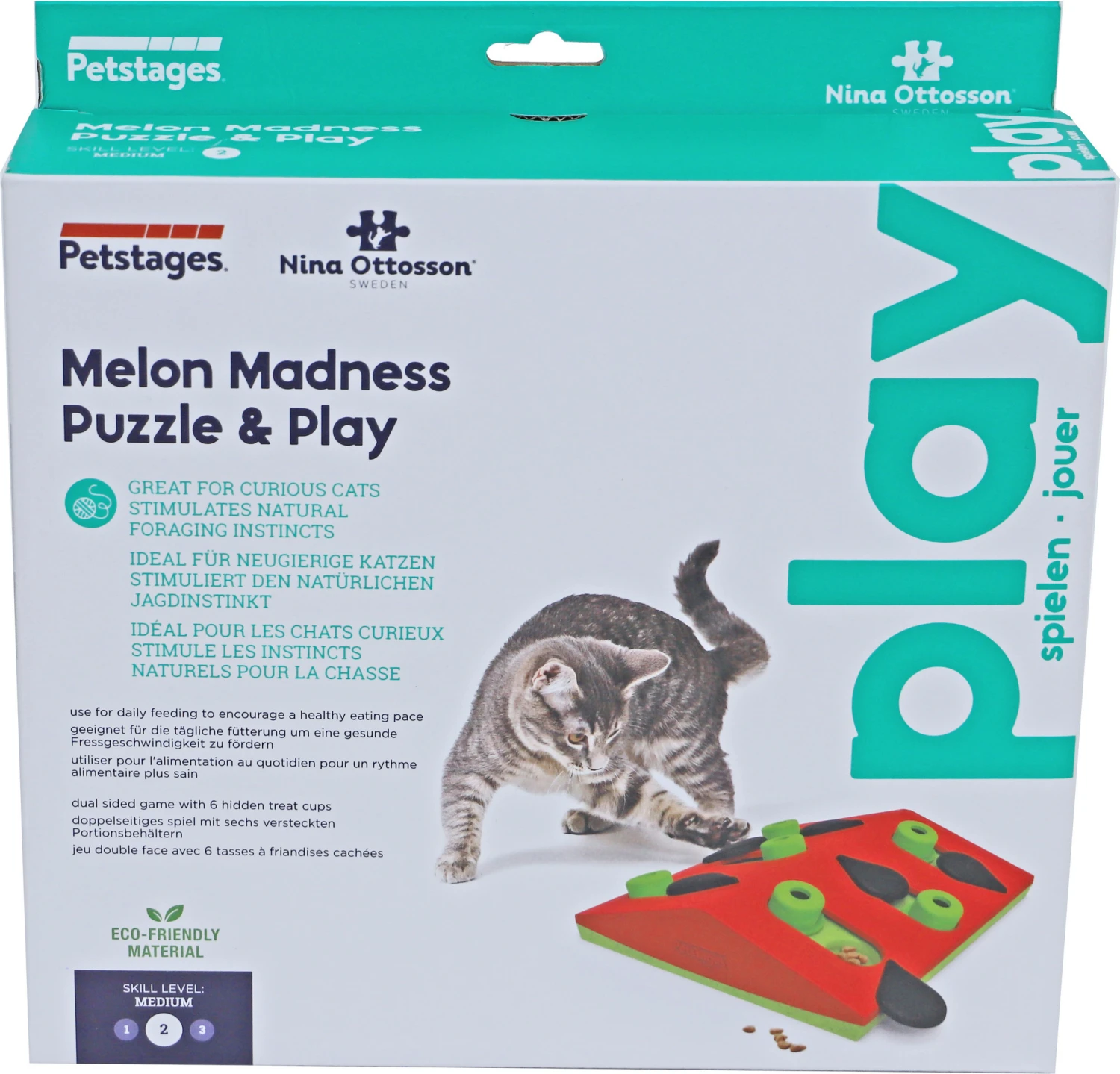 Nina Ottosson melon madness puzzle and play het speelplezier begint Miauw! Nieuwsgierige katten zullen dol zijn op de uitdaging van de melon madness puzzle and play van Nina Ottosson! Katten slaan op de haringen en draaien de zwarte “zaden” van dit dubbelzijdige spel om lekkernijen te ontdekken in de 6 verborgen traktatiecompartimenten en in de 6 haringen. Pas de moeilijkheidsgraad van de puzzel aan om het gemakkelijker te maken voor beginners of uitdagender voor slimme katten. Laat het spel beginnen! Moeilijkheidsgraad 2.