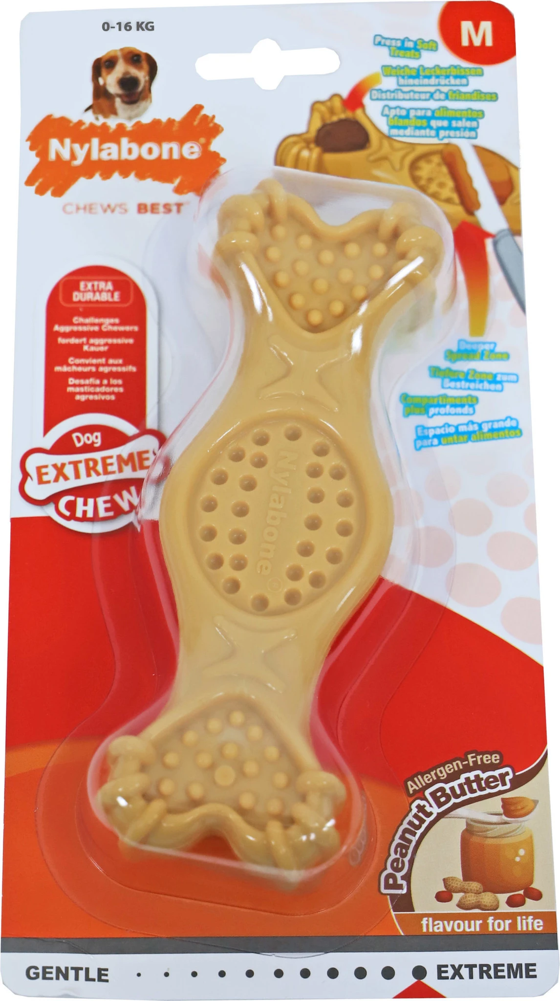 Nylabone Extreme Chew fill it and treat is geschikt voor volwassen honden met een stevige kauwbehoefte. Geschikt voor honden tot 16 kg, pindakaassmaak, geschikt voor honden met een voedselallergie en werkt als een tandenborstel tijdens het kauwen.
