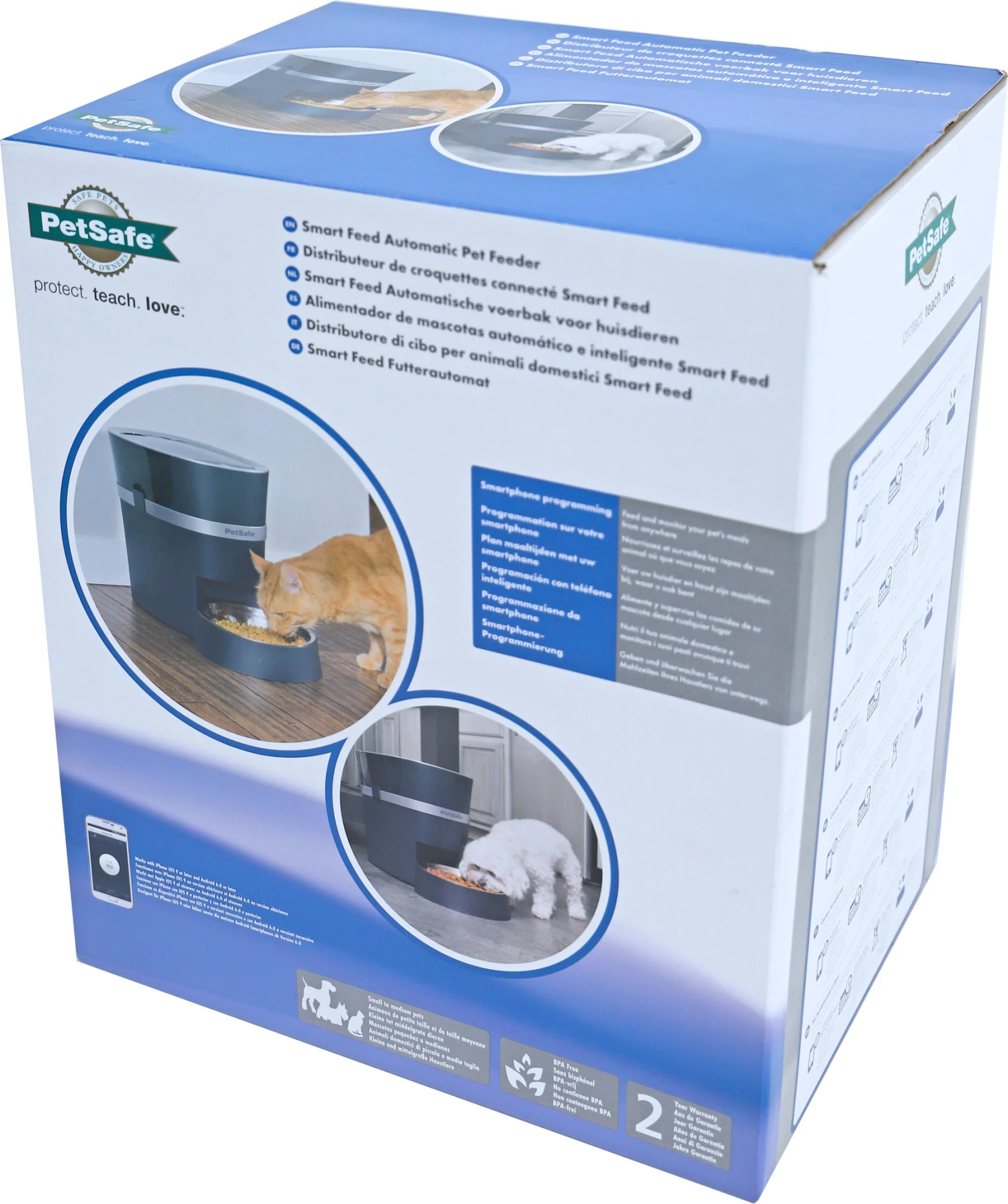 De PetSafe voederautomaat Smart Feed is een ultramoderne automatische voederautomaat voor honden en katten. De voederautomaat zorgt voor gemoedsrust tijdens maaltijden. Het maakt verbinding via Wi-Fi en stelt u in staat om de maaltijden van uw huisdier rechtstreeks vanaf uw smartphone te programmeren, plannen, aanpassen en controleren.