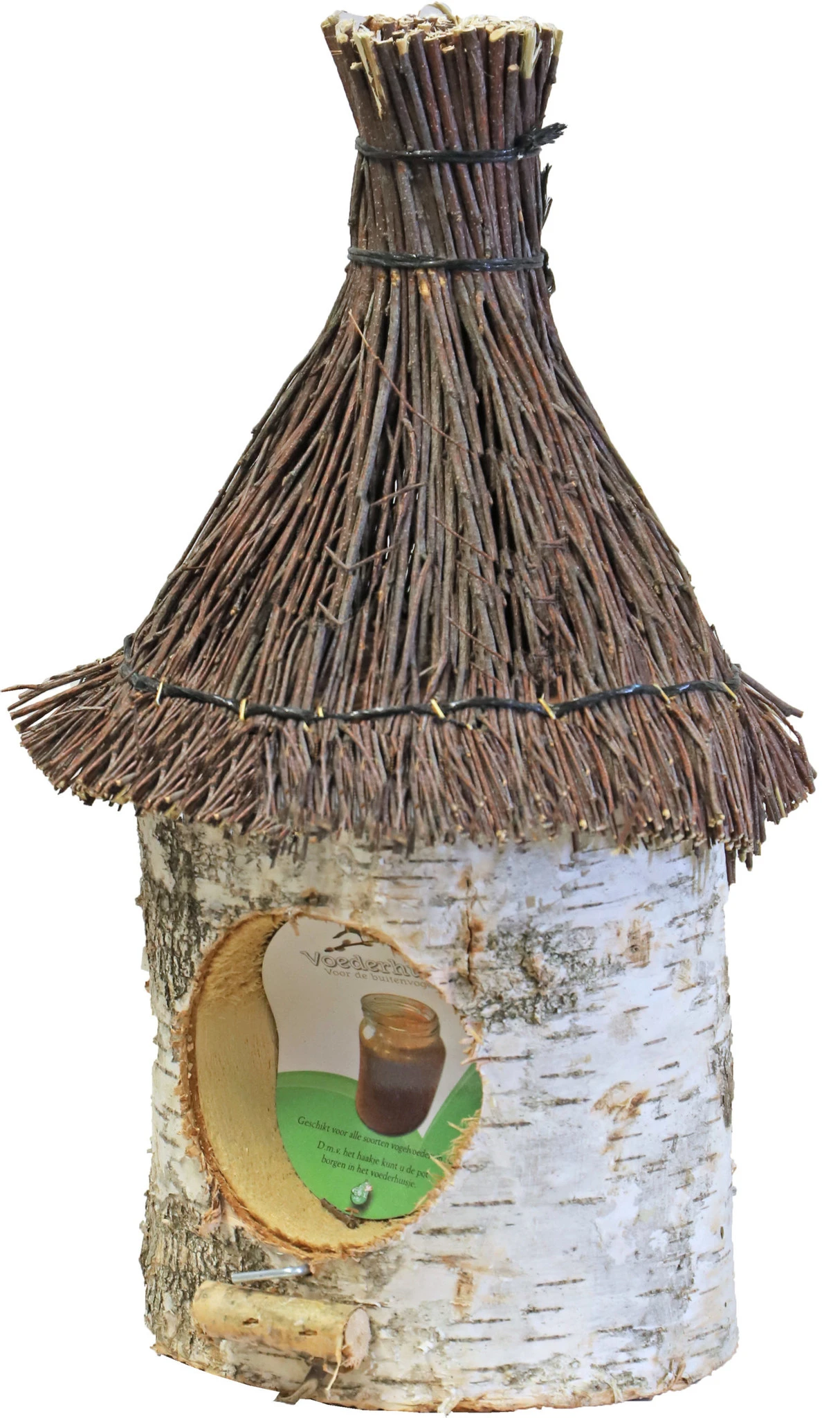 Pindakaaspot houder berken met tenen dak. Een pot vogelpindakaas voor buitenvogels kan u heel gemakkelijk ophangen met deze berken pindakaaspothouder. Deze pindakaaspothouder is verkrijgbaar met een berken, tenen of stro dak. Hang de pindakaaspothouder aan een muur, boom of schutting en schuif een pot pindakaas voor vogels (zonder deksel) in de berken houder. Zo creëert u een drukbezochte voederplaats voor veel kleurrijke buitenvogels.