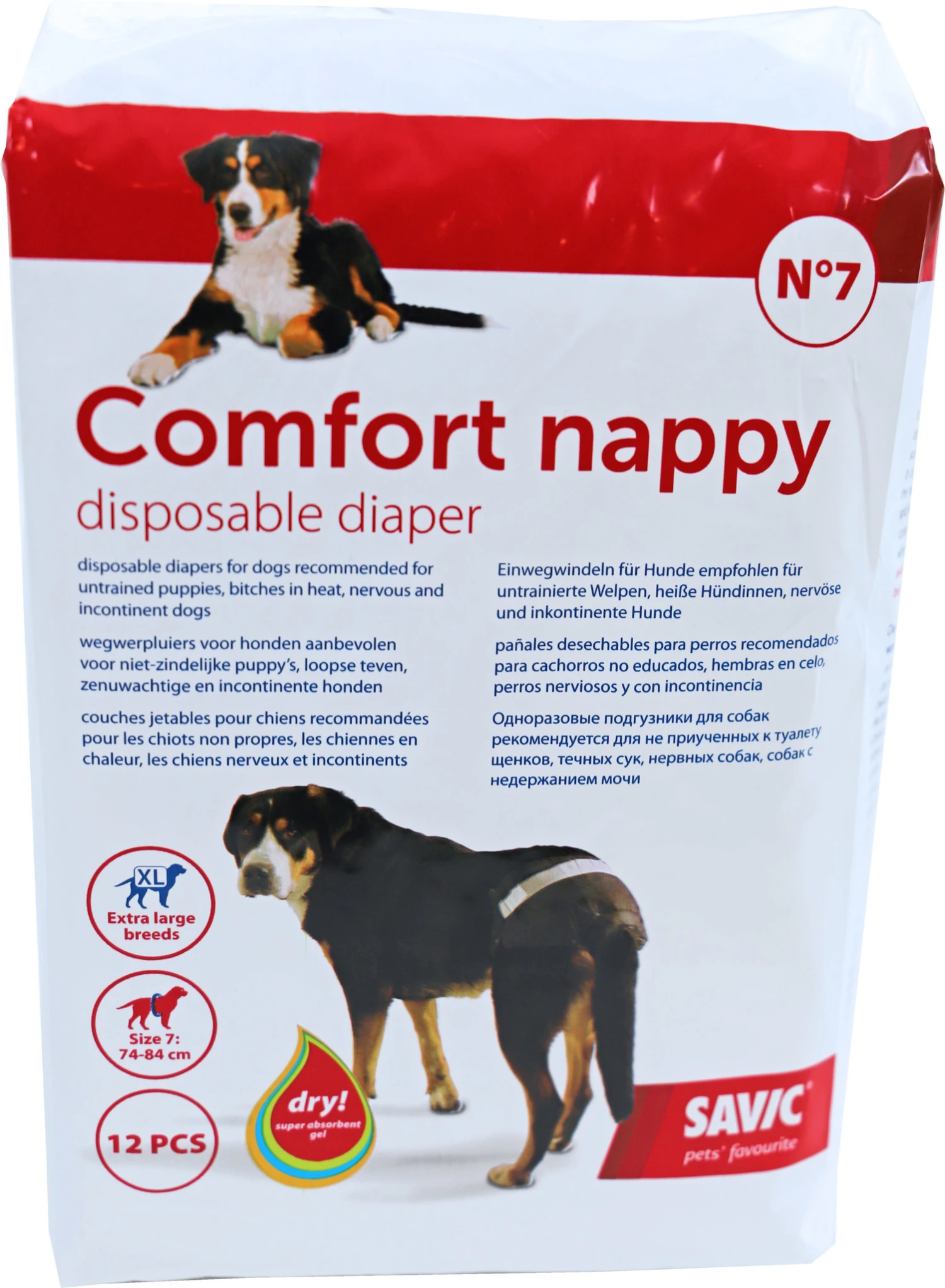 De Comfort Nappy is een super absorberende pamper die kan worden gebruikt door onzindelijke puppy’s, loopse teven, nerveuze en incontinente honden. De Comfort Nappy helpt te vermijden dat de puppy of de hond het tapijt, vloer, sofa, …. bevuilt. De pamper biedt een optimale bescherming dankzij de super absorberende gel die bloed of urine absorbeert, met als resultaat dat de pamper droog is binnen enkele seconden. De hond houdt het droog en is vrij van irritaties of infecties. De pamper is zwart gekleurd langs de buitenzijde met als voordeel dat er niks kan doorschijnen. De pamper moet worden vervangen wanneer deze bevuild is en moet bij het huishoudelijke afval worden gegooid. De pampers zijn beschikbaar in 7 verschillende afmetingen, gelieve de omtrek van de hondenbuik op te meten om de correcte grootte van de pamper te kunnen kiezen.